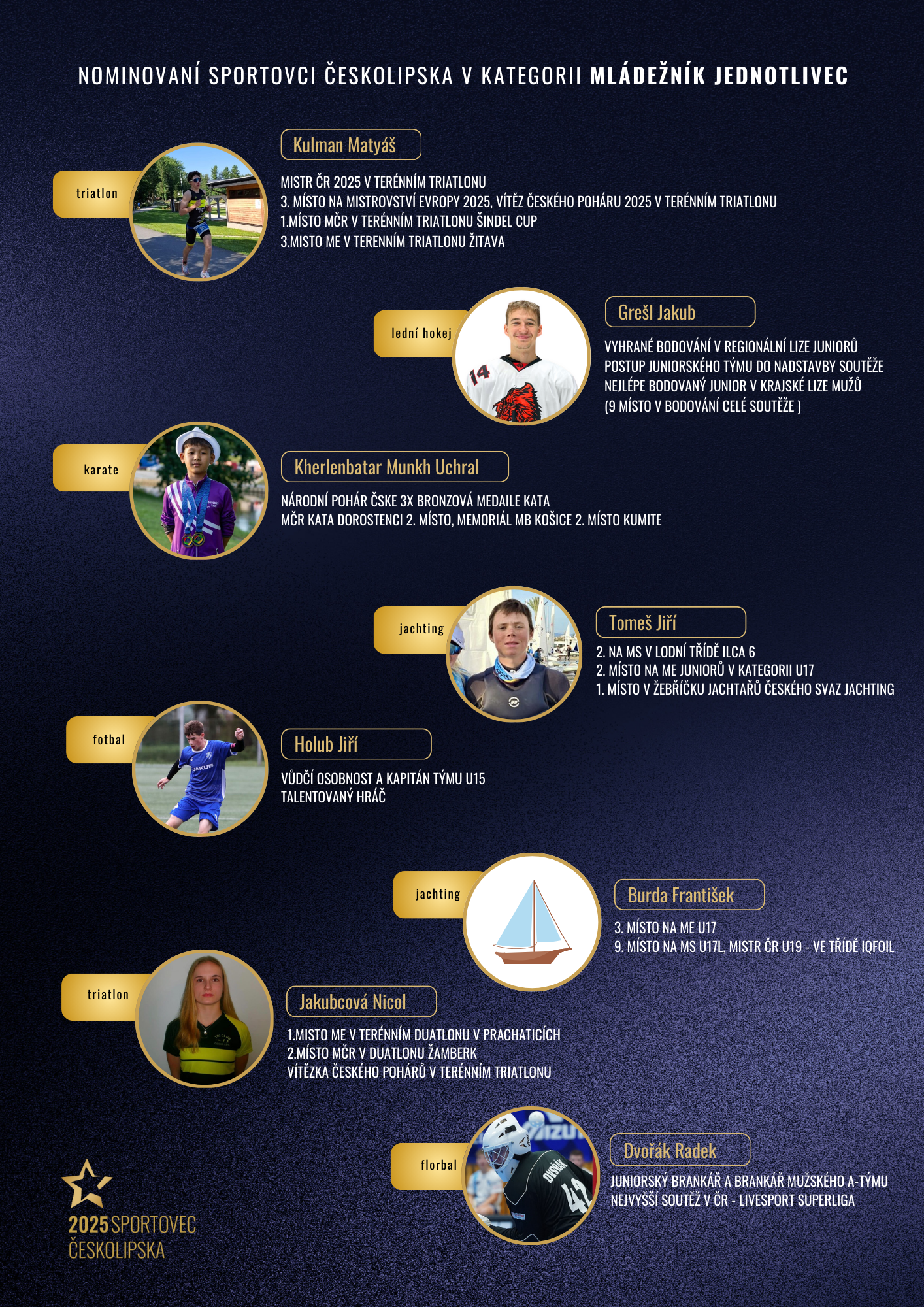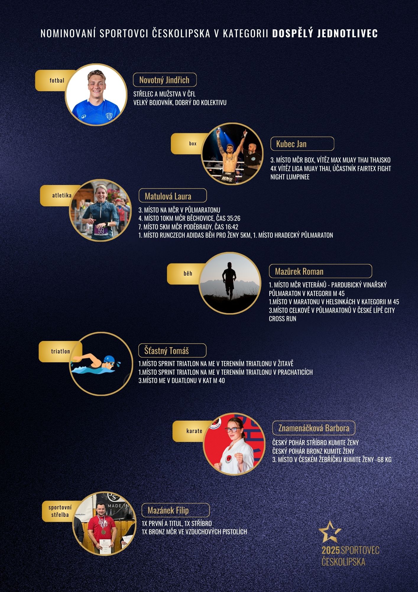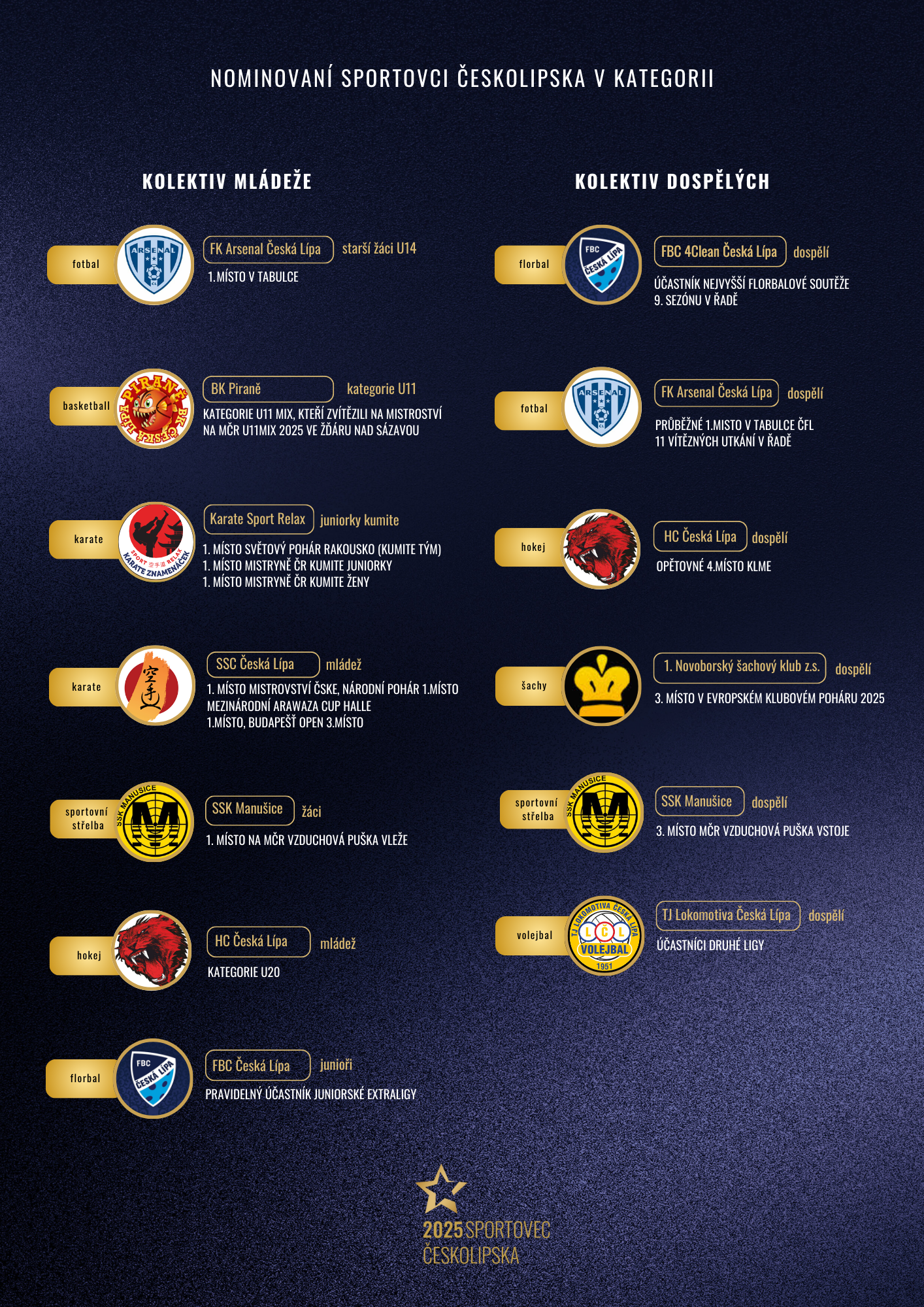 Jakýkoliv českolipský sportovec, který se výkonnostně účastnil daného kalendářního roku, za který je anketa vyhlašována. V mládežnické anketě se mohou účastnit sportovci a kolektivy do 19 let, do dospělé nominace se pak mohou dostat sportovci, kteří zasáhli do dané sezony ve výkonu v kategorii dospělých. Do kategorie veteránů mohou vstoupi sportovci, kteří překročili věk 55 let a stále sportují v českolipském prostředí. Trenérem je člověk, který se věnuje rozvoji sportovního odvětví napříč věkovou strukturou. Krajánkem se rozumí sportovec napříč věkovým spektrem, který se v České Lípě vyrostl, avšak v současné době reprezentuje oddíl v jiném městě/státu. Kategorie Výkon roku, Síň slávy a Handicap vyhlašují organizátoři.